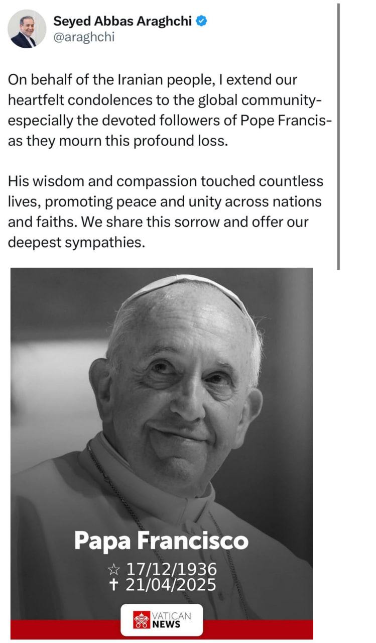 سید عباس عراقچی در توییتی درگذشت پاپ فرانسیس رهبر کاتولیک های جهان را تسلیت گفت
