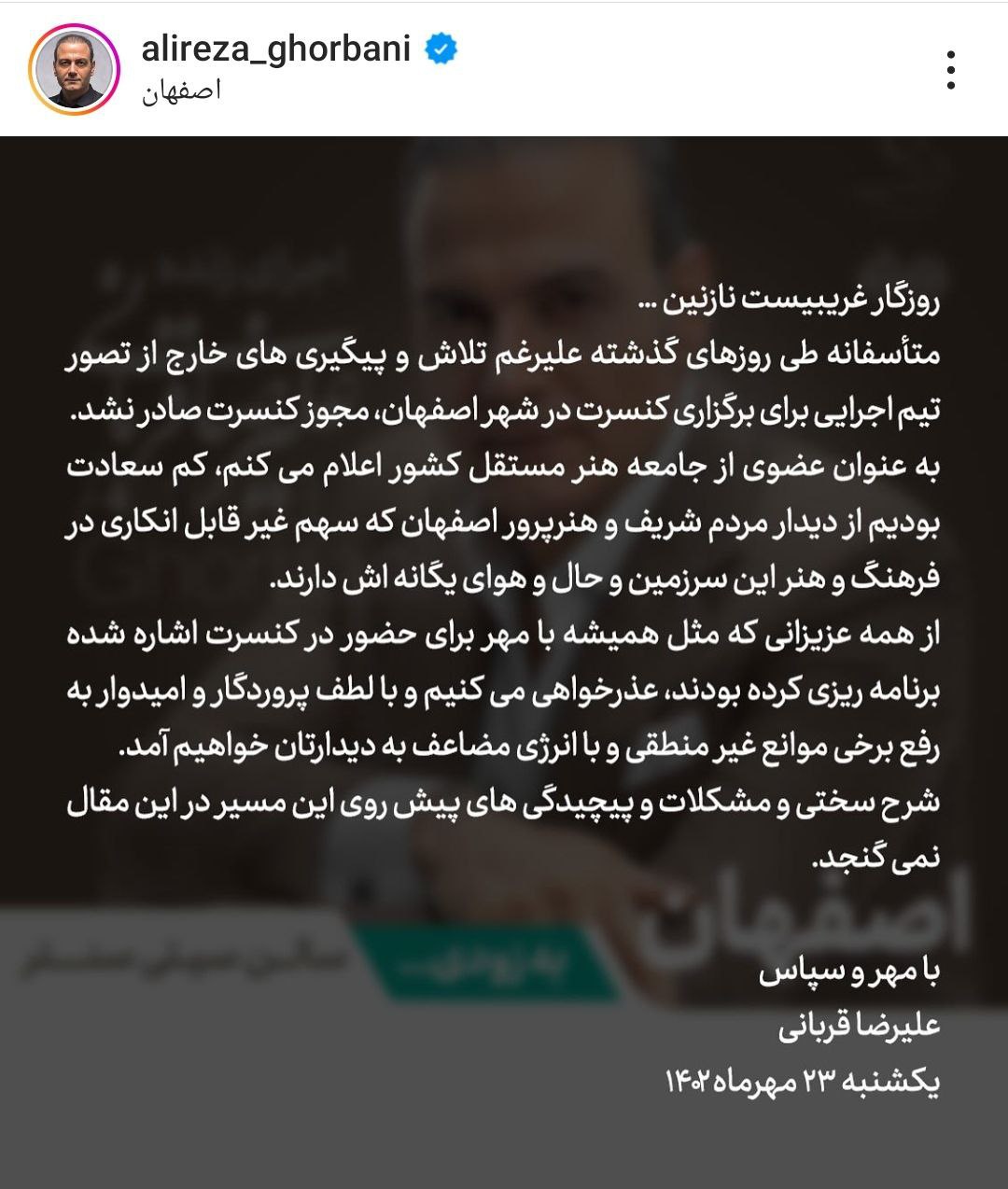 علیرضا قربانی به دلیل عدم اجازه ساز زدن به نوازنده های خانم گروهش در اصفهان، هفت شب (۱۴ سانس) کنسرت را در نصف جهان لغو کرد.