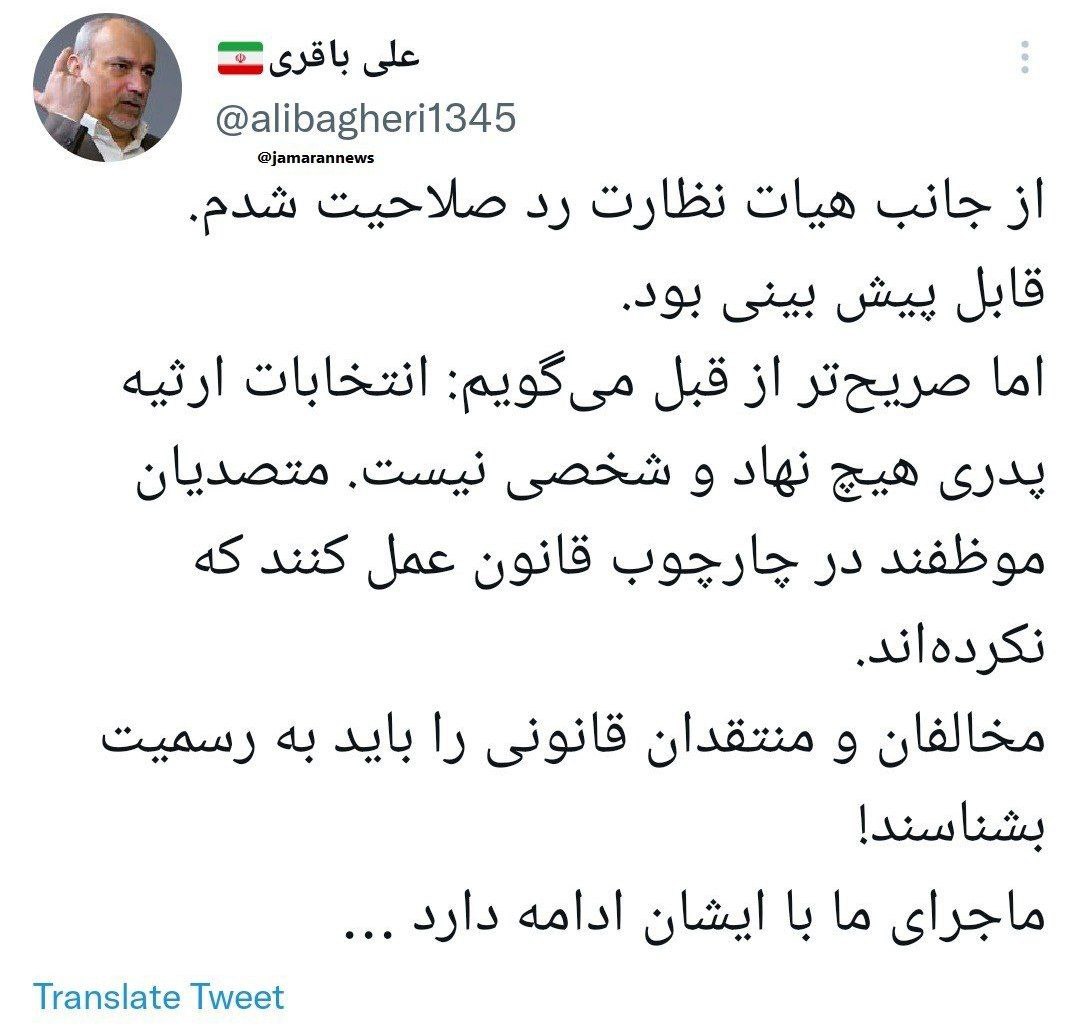 🔹 از جانب هیات نظارت رد صلاحیت شدم. قابل پیش بینی بود. اما صریحتر از قبل میگویم: انتخابات ارثیه پدری هیچ نهاد و شخصی نیست. متصدیان موظفند در چارچوب قانون عمل کنند که نکردهاند. مخالفان و منتقدان قانونی را باید به رسمیت بشناسند! ماجرای ما با ایشان ادامه دارد..