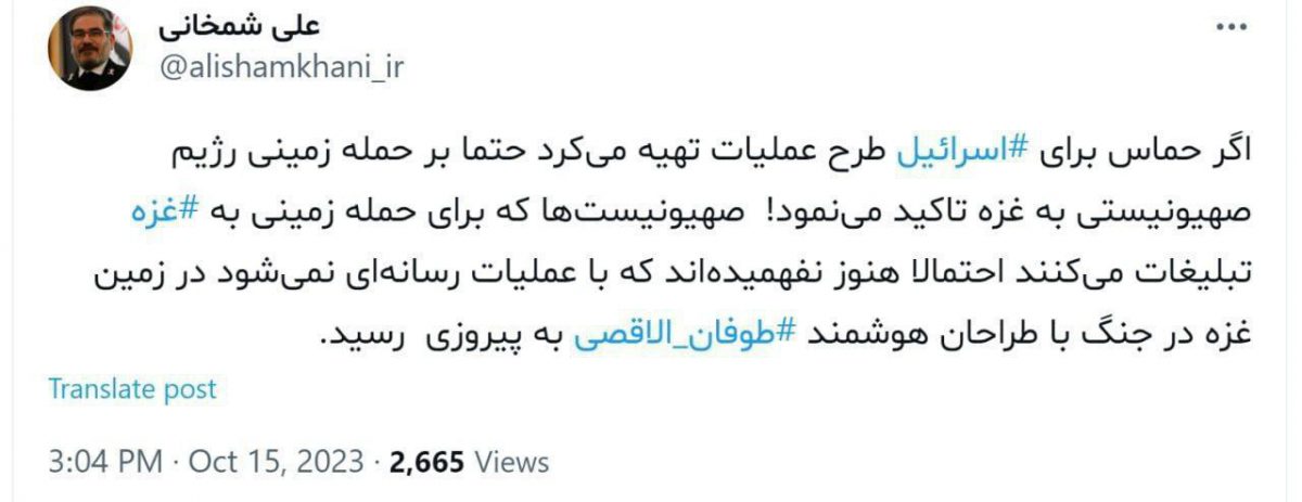 علی شمخانی، مشاور رهبرانقلاب: اسرائیل جرات حمله زمینی به غزه را ندارد.