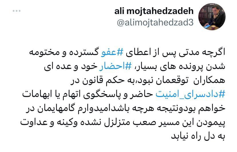 علی مجتهدزاده از احضار خود و تعدادی از وکلا به دادسرای امنیت خبر داد.