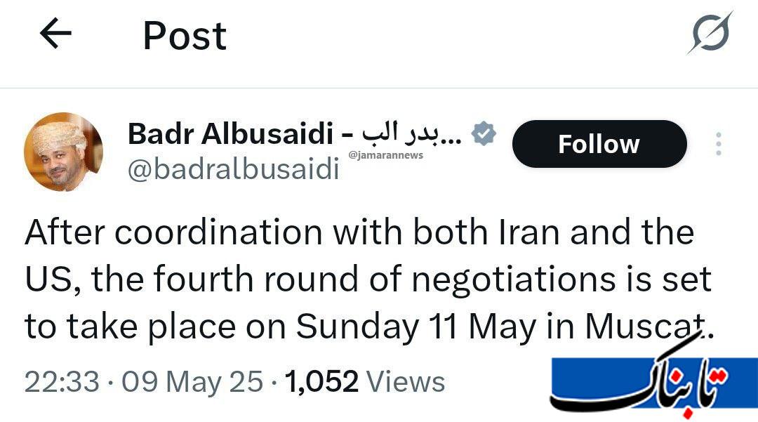 بدر البوسعیدی نوشت که پس از هماهنگی با ایران و آمریکا، چهارمین دور مذاکرات قرار است یکشنبه در مسقط انجام شود.