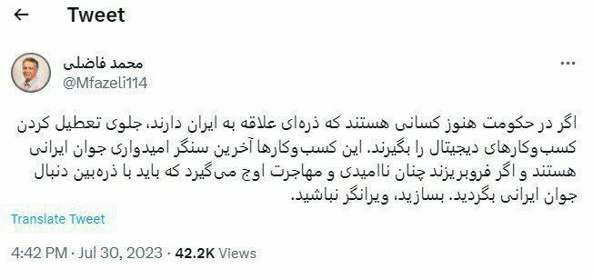 محمد فاضلی، پژوهشگر و جامعهشناس: اگر در حکومت هنوز کسانی هستند که ذرهای علاقه به ایران دارند، جلوی تعطیل کردن کسبوکارهای دیجیتال را بگیرند. این کسبوکارها آخرین سنگر امیدواری جوان ایرانی هستند و اگر فروبریزند چنان ناامیدی و مهاجرت اوج میگیرد که باید با ذرهبین دنبال جوان ایرانی بگردید. بسازید، ویرانگر نباشید.