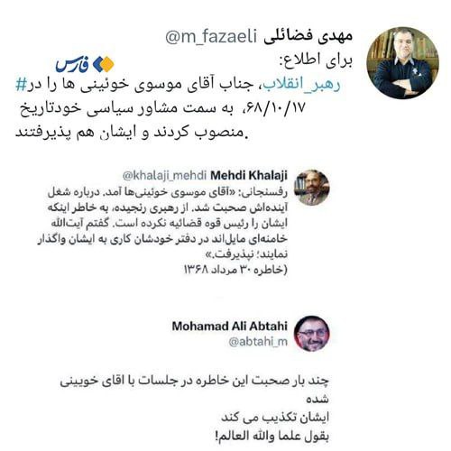 فضائلی، عضو دفتر حفظ و نشر آثار رهبر انقلاب: رهبر انقلاب موسوی خوئینیها را سال ۶۸ بهسِمت مشاور سیاسی خود منصوب کردند، او هم پذیرفت.