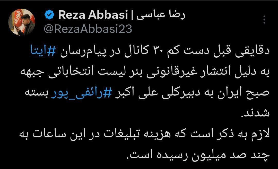 🔹رضا عباسی مدیر کانال خبر فوری در توییتی نوشت: دقایقی قبل دست کم ۳۰ کانال در پیامرسان ایتا به دلیل انتشار غیرقانونی بنر لیست انتخاباتی جبهه صبح ایران به دبیرکلی علی اکبر رائفی پور بسته شدند.