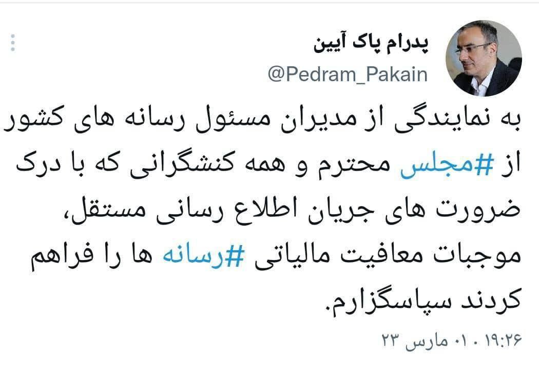 قدردانی پاک آیین از مجلس بابت معافیت مالیاتی رسانهها