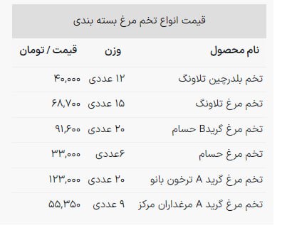 🔹قیمت تخم مرغ بسته بندی شده در بسته ۶ عددی ۳۳ هزار تومان است برای خرید بسته ۹ عددی هم باید ۵۵ هزار تومان پرداخت کنید. بر این اساس خرید بسته های بزرگ تر تخم مرغ به صرفه تر خواهد بود.