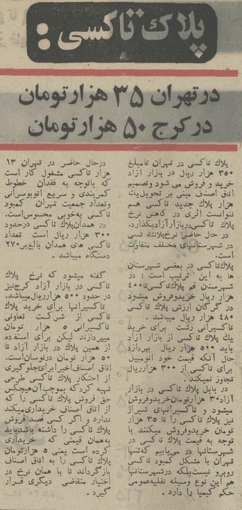 🔹امتیاز تبدیل یک خودروی سواری به تاکسی در سال ۱۳۵۲ به صورت رسمی و در بازار آزاد خرید و فروش میشد. روزنامه اطلاعات در ۵ آبان ۱۳۵۲ طی گزارشی به بازار رسمی و آزاد پلاک تاکسی در پایتخت و شهرستانها پرداخت. قیمت پلاک تاکسی در تهران ۵۰ و در کرج ۳۵ هزار تومان، پلاک قم ۴۰ و پلاک رشت ۵۰ هزار تومان خرید و فروش میشد.