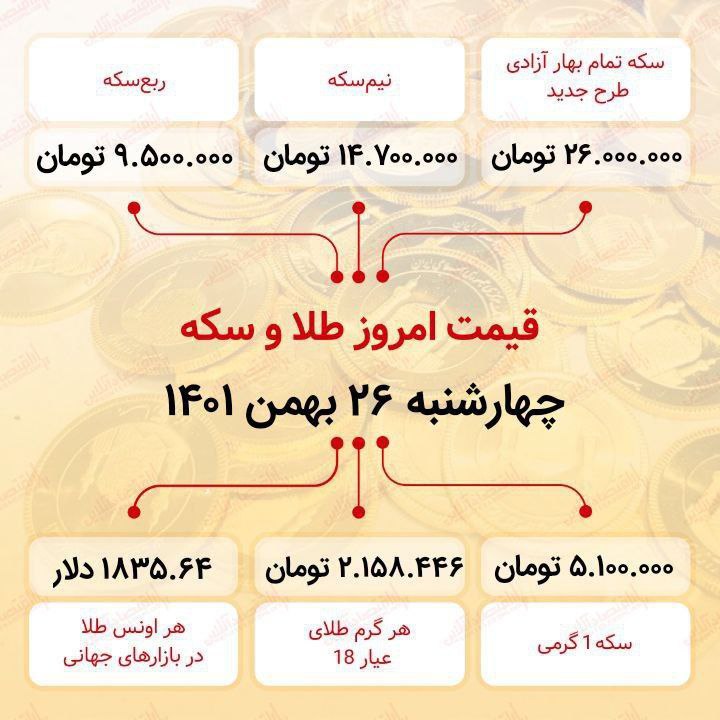 قیمت طلا و سکه چهارشنبه ۲۶ بهمنماه ۱۴۰۱