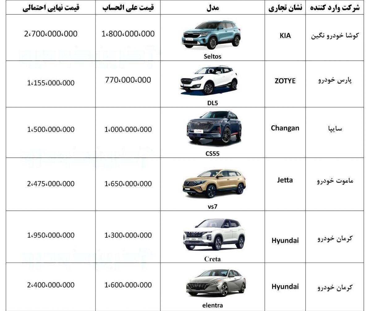 قیمت ۶ خودروی وارداتی اعلام شد