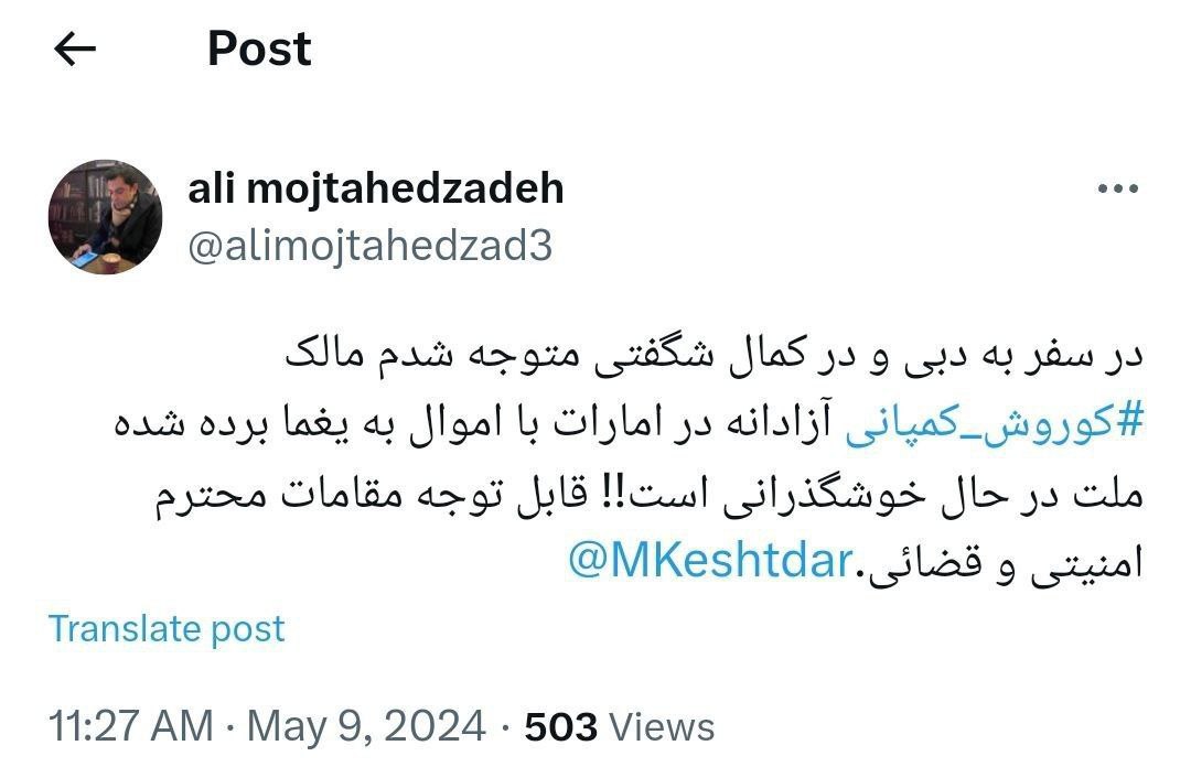 🔹در سفر به دبی و در کمال شگفتی متوجه شدم مالک کوروش کمپانی آزادانه در امارات با اموال به یغما برده شده ملت در حال خوشگذرانی است!! قابل توجه مقامات محترم امنیتی و قضائی.