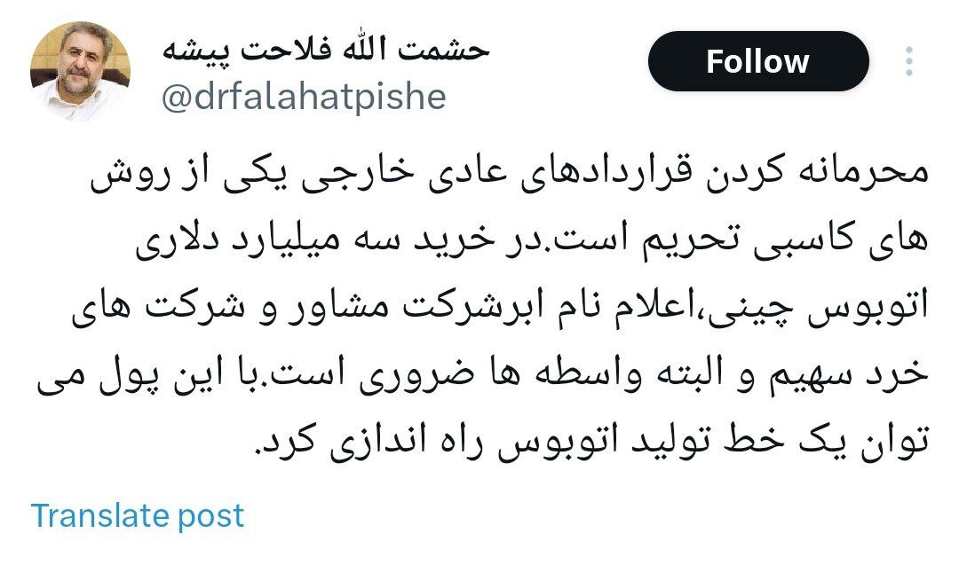 ماینده ادوار مجلس: 🔹محرمانه کردن قراردادهای عادی خارجی یکی از روش های کاسبی تحریم است.در خرید سه میلیارد دلاری اتوبوس چینی،اعلام نام ابرشرکت مشاور و شرکت های خرد سهیم و البته واسطه ها ضروری است.