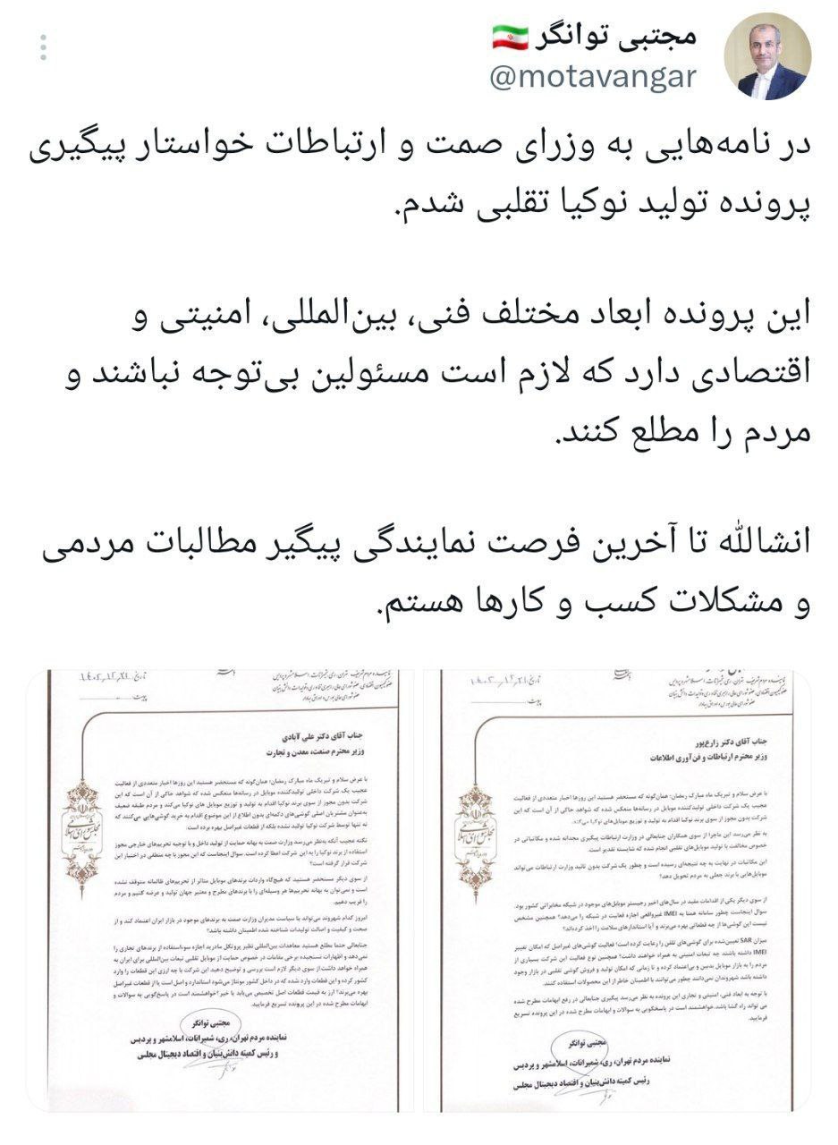 مجتبی توانگر در نامهای به وزرای صمت و ارتباطات نسبت به تولید نوکیا تقلبی در ایران اعتراض کرد