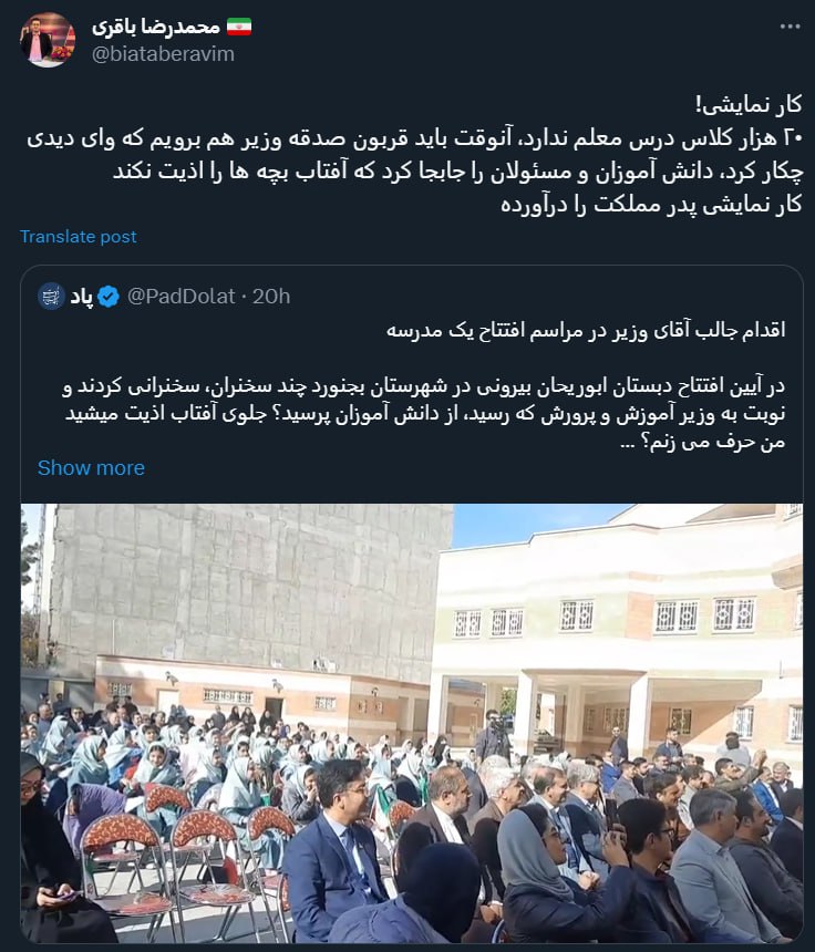 ٢٠ هزار کلاس درس معلم ندارد، آنوقت باید قربون صدقه وزیر هم برویم که وای دیدی چکار کرد، دانش آموزان و مسئولان را جابجا کرد که آفتاب بچه ها را اذیت نکند.