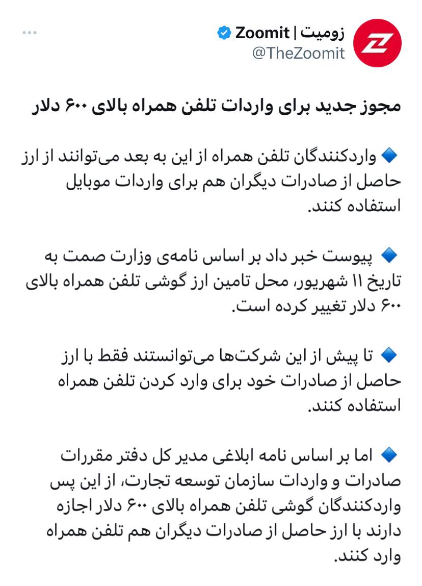 مجوز جدید برای واردات تلفن همراه بالای ۶۰۰ دلار