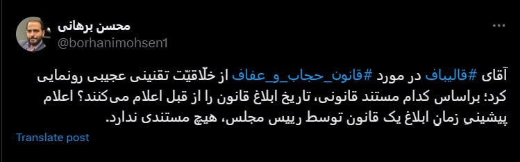 محسن یرهانی، حقوقدان: 🔹آقای قالیباف در مورد قانون حجاب و عفاف از خلّاقیّت تقنینی عجیبی رونمایی کرد؛ براساس کدام مستند قانونی، تاریخ ابلاغ قانون را از قبل اعلام میکنند؟ اعلام پیشینیِ زمانِ ابلاغ یک قانون توسط رییس مجلس، هیچ مستندی ندارد.