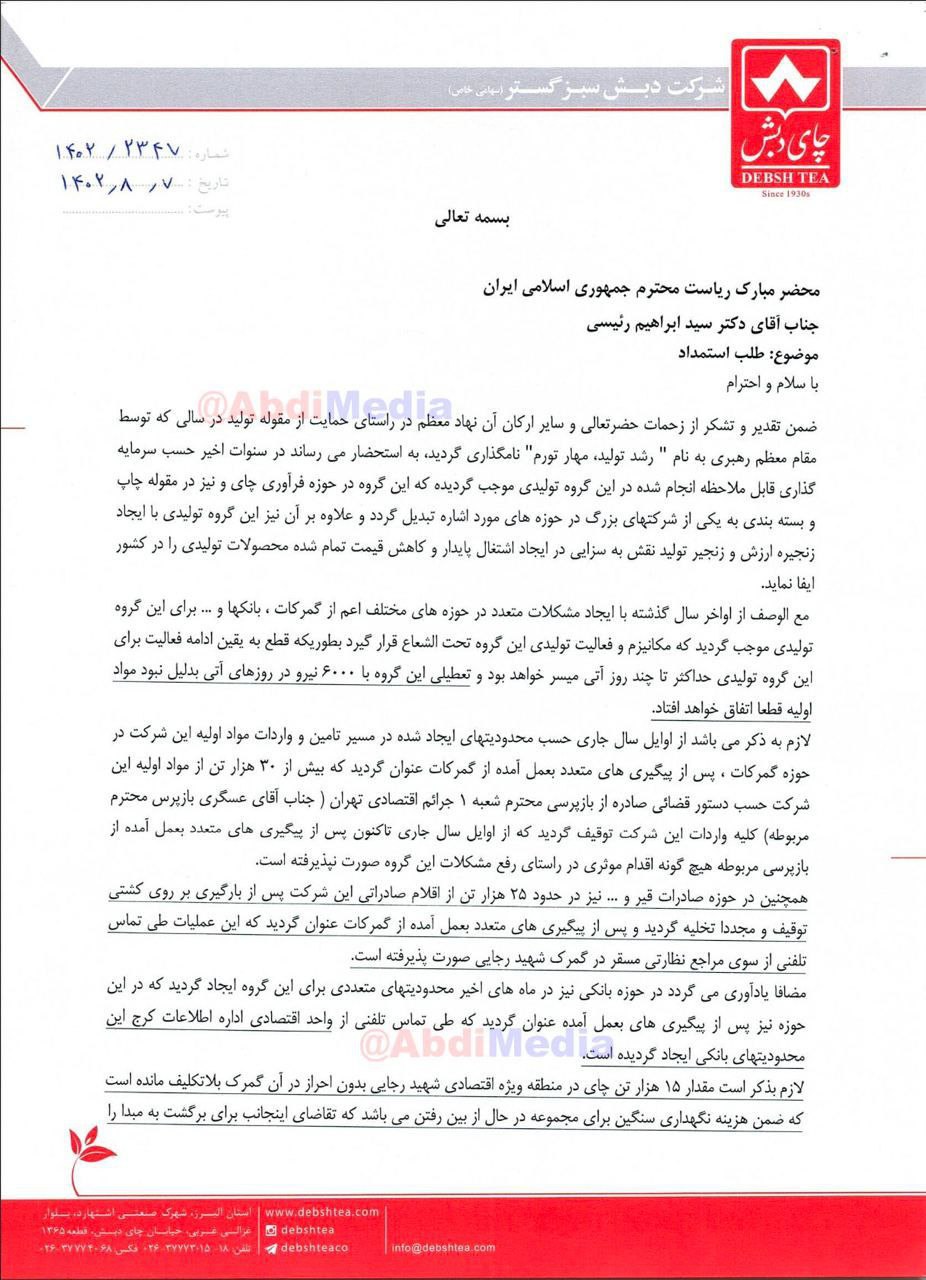 مدیرعامل چای دبش، ٣۴ روز قبل از افشای فساد سه میلیارد دلاری، به ابراهیم رئیسی نامه نوشته و خواستار حل مشکلات قضایی و اداری شده است.