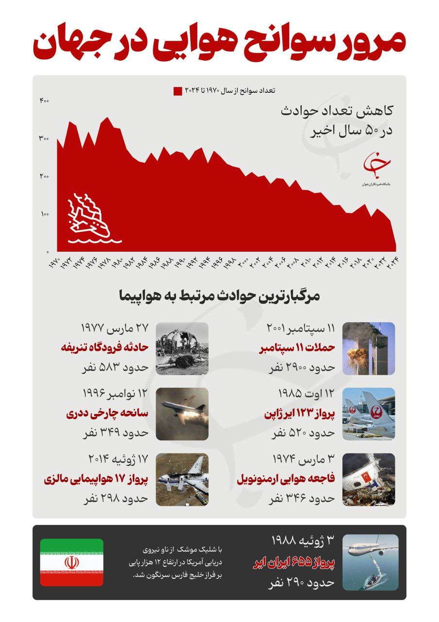 🔹این حادثه، همراه با فاجعه اخیر در قزاقستان، بار دیگر توجهها را به سوانح هوایی جلب کرده است. هرچند آمارها نشان میدهند که در ۵۰ سال گذشته تعداد قربانیان حوادث هوایی کاهش یافته./باشگاه خبرنگاران