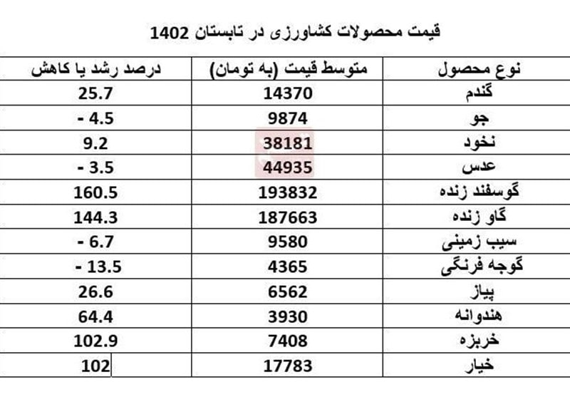 🔹در تابستان ۱۴۰۲ متوسط قیمت جو، عدس، سیب زمینی و گوجه نسبت به سال گذشته کاهش و قیمت گندم، نخود، گوسفند و گاو زنده، محصولات جالیزی و انواع میوهها افزایش داشته است