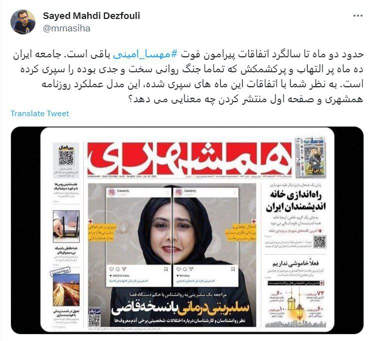 مستندساز سفیر فیلم: دو ماه مانده به سالگرد مهسا امینی، انتشار این تیتر و عملکرد روزنامه همشهری چه معنایی میدهد