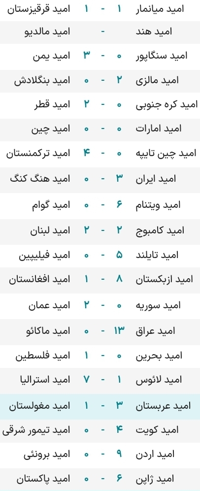امید عربستان سعودی هم با وجود سرمایهگذاری نجومی طی سالهای اخیر در فوتبال به زحمت از پس مغولستان برآمد. امیدهای ژاپن مدعی قهرمانی آسیا هم شش گل به پاکستان زدند.