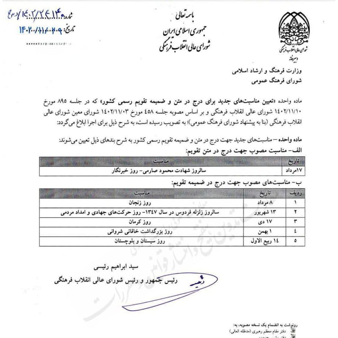 🔹 طبق مصوبه شورایعالی انقلاب فرهنگی ۸ مرداد روز زنجان، ۱۷ مرداد «روز خبرنگار»، ۱۳ شهریور روز حرکتهای جهادی و مردمی، ۱۷ دی روز کرمان، ۱ بهمن روز بزرگداشت خاقانی و ۱۴ ربیعالاول روز سیستان و بلوچستان به تقویم اضافه میشود.