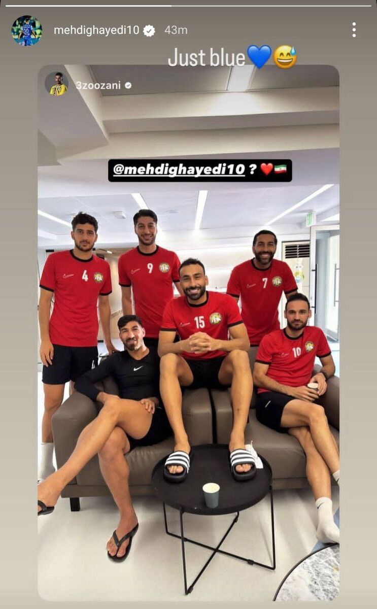 عبدالعزیز حمد همبازی سابق مهدی قایدی در اتحاد کلبا یک عکس در کنار دیگر همبازیان ایرانی اش که همگی پیراهن قرمز به تن داشتند منتشر کرد. او زیرکانه قایدی را با یک قلب قرمز منشن کرد که ستاره ریز نقش پیشین استقلال هم همان استوری را بازنشر کرد و کنار یک قلب آبی نوشت: «فقط آبی» تا بدین ترتیب به استوری عبدالعزیز واکنش نشان بدهد.