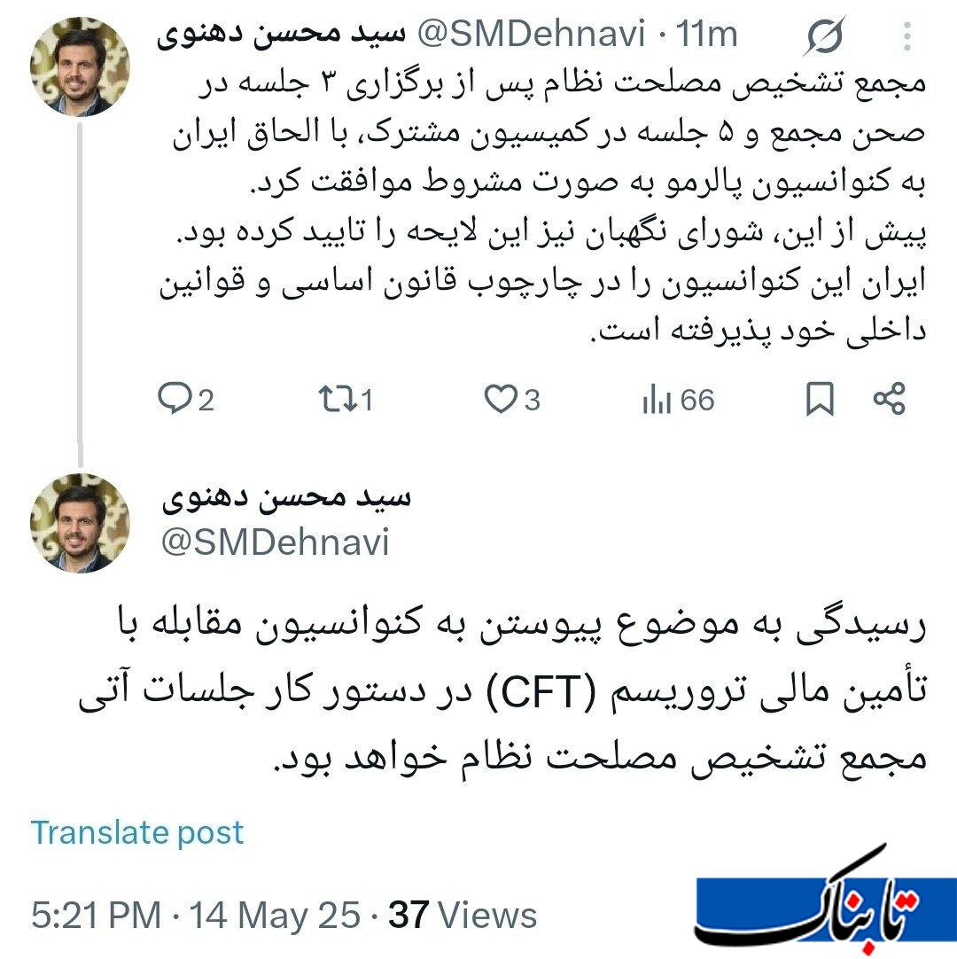 سخنگوی مجمع تشخیص مصلحت نظام در شبکه ایکس با انتشار توییتی خبر از موافقت مجمع تشخیص مصلحت نظام بصورت مشروط با پالرمو داد.