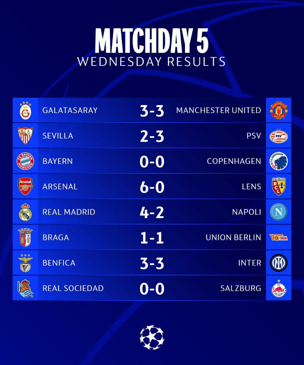 پرونده هفته پنجم، هفته ماقبل پایانی مرحله گروهی لیگ قهرمانان اروپا چهارشنبه شب با برگزاری شش دیدار در گروههای A تا D و مشخص شدن چهار تیم صعودکننده دیگر به مرحله حذفی مسابقات بسته شد.