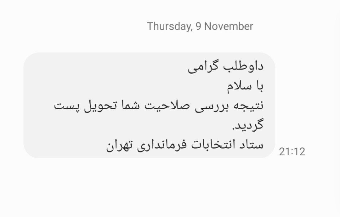 🔹دقایقی پیش پیامکی از طرف فرمانداری تهران برای کاندیداهای شرکت در انتخابات مجلس ارسال شد که نتیجه بررسی صلاحیت های کاندیداها در مرحله هییت اجرایی مشخص شده است.