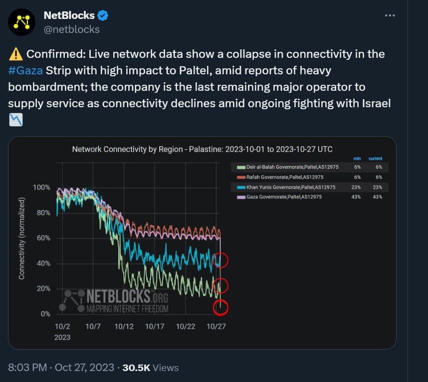 نت بلاکس اعلام کرد ارتباط اینترنتی نوار غزه با دنیای بیرون کاملا قطع شده است