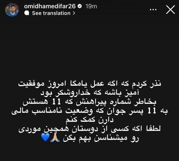 🔹دقایقی پیش امید حامدی فر با انتشار استوری در صفحه اینستاگرامش از نذر خودش برای سلامتی کوین یامگا خبر داد.