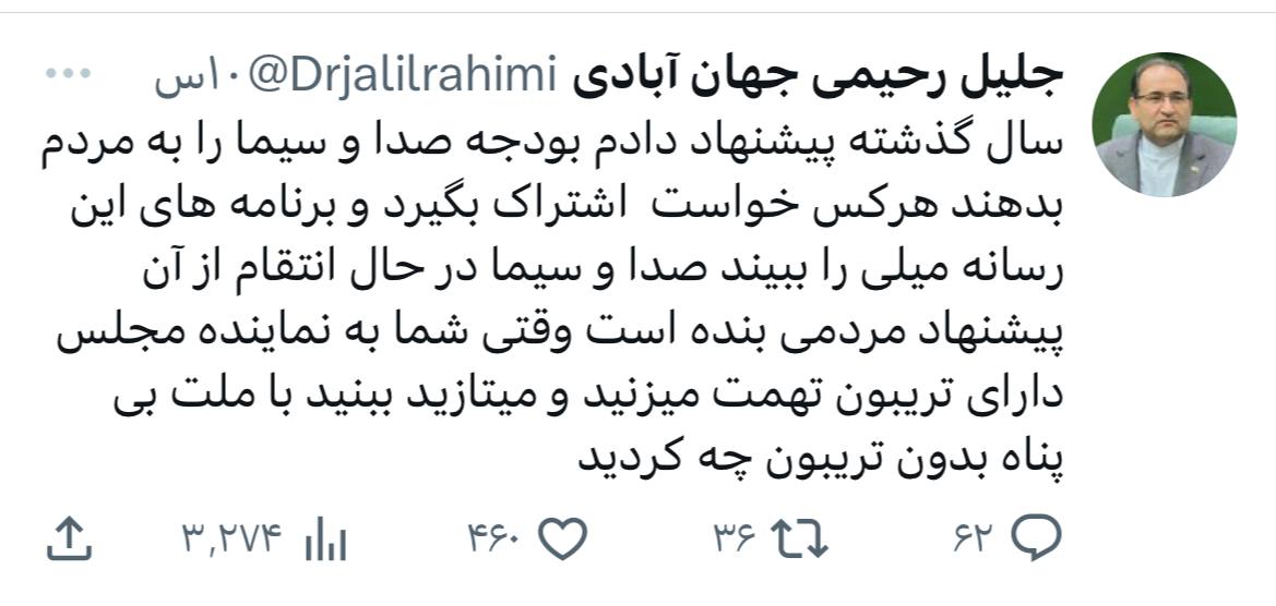 جلیل رحیمی جهان آبادی نماینده مجلس در پیامی توئیتری به اتهامهای شبکه سه صدا و سیما پاسخ داد.