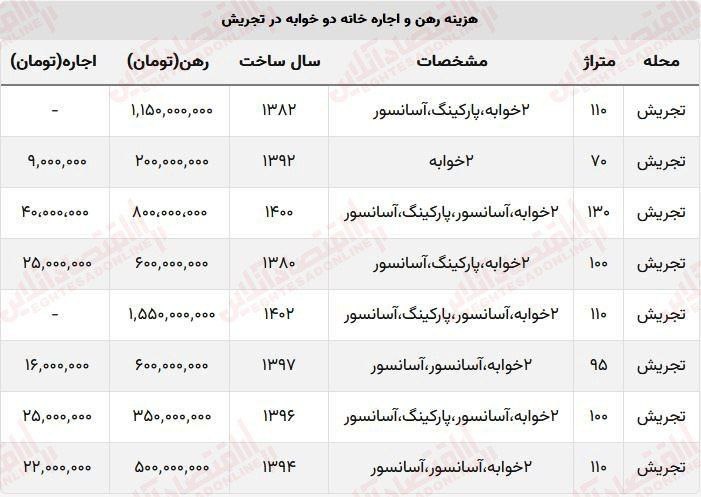 هزینه اجاره خانه ۲ خوابه در تجریش چند؟