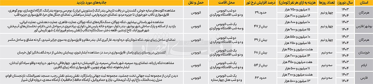 🔹 نگاهی به برخی از این تورها و مقایسه آنها با سال گذشته نشان میدهد که افزایش ۳۹ تا ۶۸ درصدی قیمت تورها در نوروز امسال را داریم.
