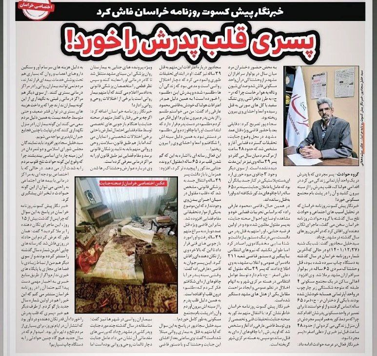 🔹یک جوان ۳۹ساله به نام علی اصغر، در بولوار سرافرازان مشهد، پس از قتل پدر ۶۵سالهاش، قلب او را از سینه در آورد و روی پشت بام مجتمع مسکونی خورد.