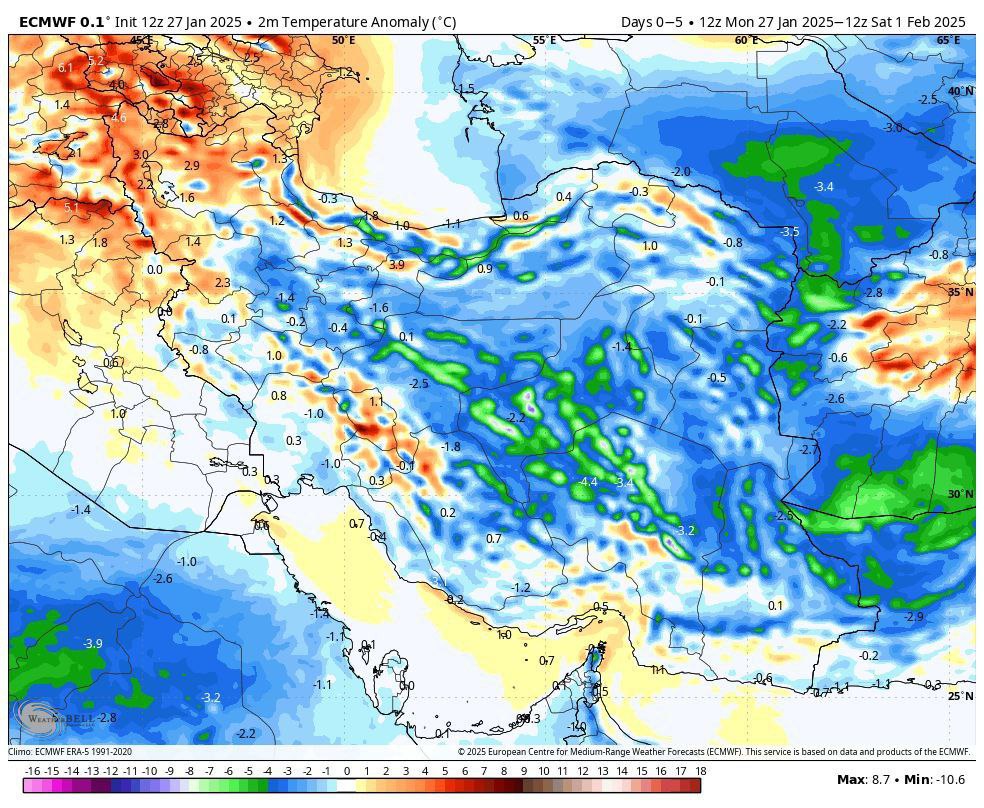 🔹برای چند روز آینده الگوی دمای غالب امسال در کشور مجدداً رخ خواهد داد و بسیاری از نقاط در فلات مرکزی کشور شاهد هوایی سردتر از نرمال خواهند بود.