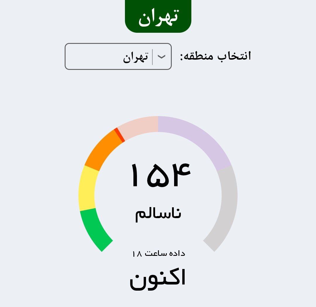 🔹شاخص آلودگی هوای پایتخت در حال حاضر ۱۵۴ است و کیفیت هوا در وضعیت قرمز و ناسالم برای همهی گروهها قرار دارد.