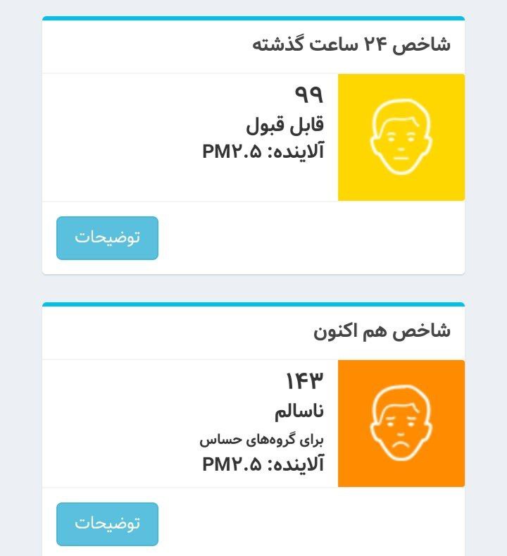 🔹بر اساس دادههای شرکت کنترل کیفیت هوای تهران، کیفیت هوای امروز پایتخت در اکثر مناطق در شرایط «ناسالم برای گروههای حساس» قرار دارد.