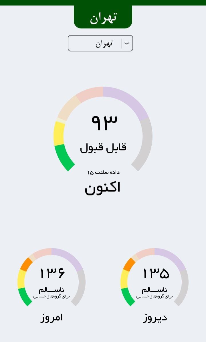 🔹سامانه پایش کیفی هوای کشور: هماکنون هوای تهران با قرار گرفتن روی عدد ۹۳ قابل قبول یا سالم است.