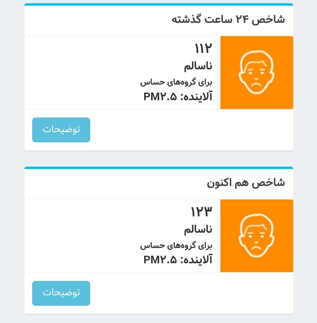 🔹بنابر اعلام شرکت کنترل کیفیت هوای تهران، شاخص آلودگی هوای پایتخت هماکنون روی عدد ۱۲۳ قرار دارد و کیفیت هوا در وضعیت نارنجی و ناسالم برای گروه حساس است.