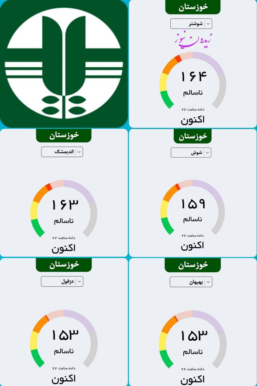 🔹براساس آخرین دادههای سامانه پایش کیفی هوای کشور، هم اکنون هوای شهرهای شوشتر، اندیمشک، شوش، دزفول و بهبهان در وضعیت قرمز و ناسالم برای همه گروه های سنی است.