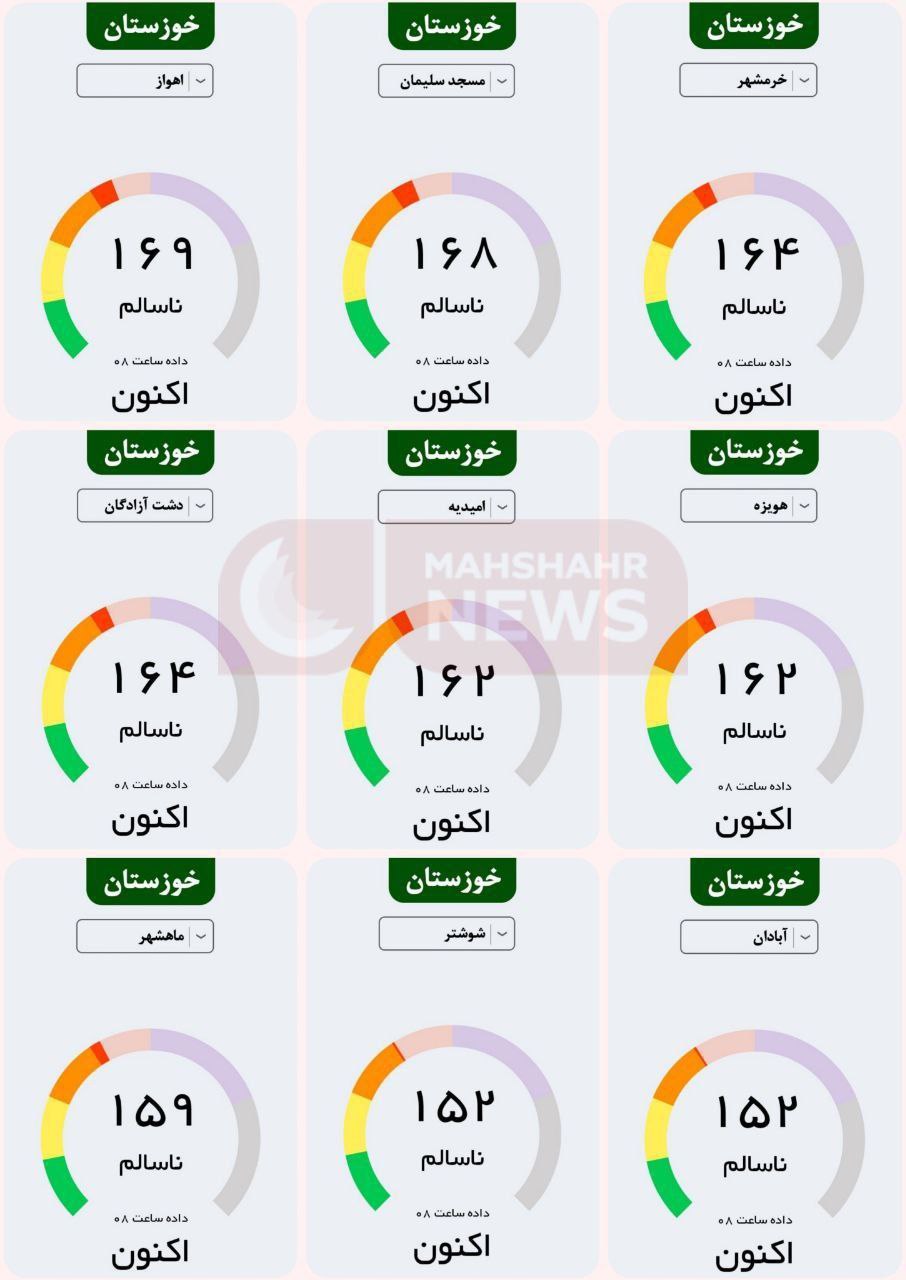 🔹براساس آخرین دادههای سامانه پایش کیفی هوای کشور، هم اکنون هوای شهرهای اهواز، مسجدسلیمان، خرمشهر، سوسنگرد، امیدیه، هویزه، بندرماهشهر، شوشتر و آبادان در استان خوزستان در وضعیت قرمز آلودگی و ناسالم برای همه گروه های سنی است.