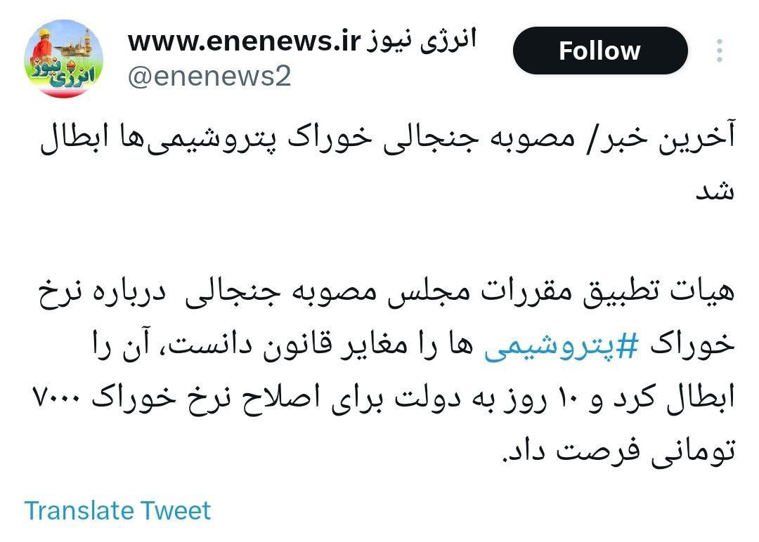 هیات تطبیق مقررات مجلس مصوبه جنجالی درباره نرخ خوراک پتروشیمی ها را مغایر قانون دانست، آن را ابطال کرد و ۱۰ روز به دولت برای اصلاح نرخ خوراک ۷۰۰۰ تومانی فرصت داد.