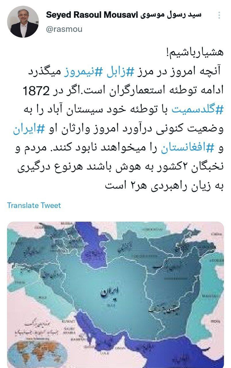 🔹آنچه امروز در مرز زابل نیمروز میگذرد ادامه توطئه استعمارگران است.اگر در ۱۸۷۲ گلدسمیت با توطئه خود سیستان آباد را به وضعیت کنونی درآورد امروز وارثان او ایران و افغانستان را میخواهند نابود کنند. مردم و نخبگان ۲کشور به هوش باشند هرنوع درگیری به زیان راهبردی هر۲ است