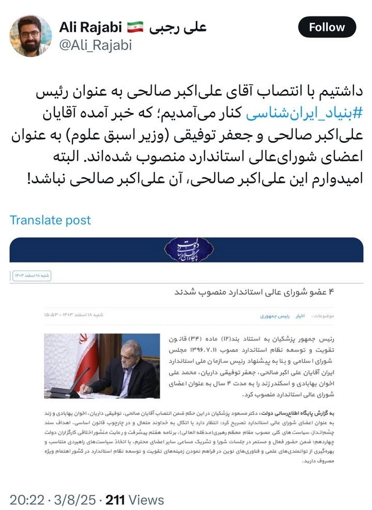 یک فعال رسانهای نسبت به انتصاب «علی اکبر صالحی» در دو سمت جداگانه واکنش نشان داد.