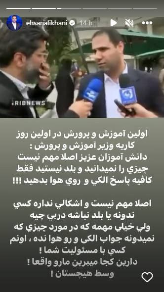 🔹احسان علیخانی در واکنش به جواب وزیر آموزش و پرورش در جواب یک خبرنگار درباره دربی یک استوری منتشر کرد.
