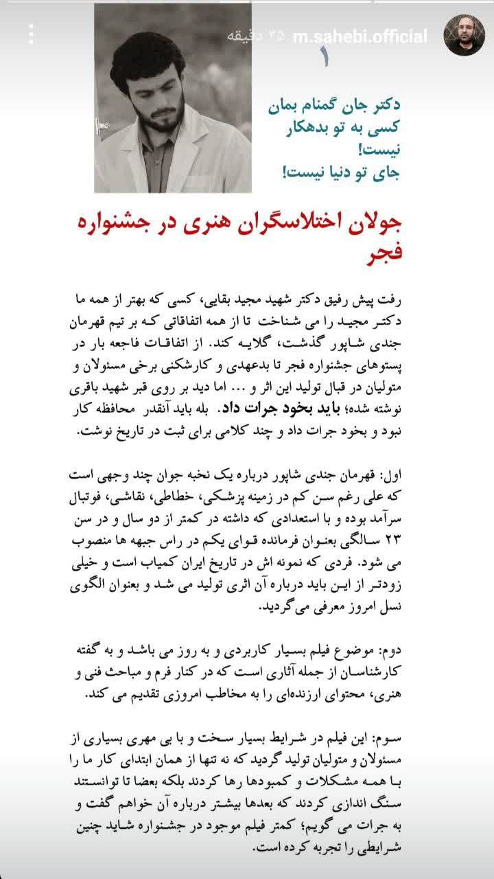 🔹تلاش اختلاس گران هنری برای حذف فیلم قهرمان جندی شاپور (زندگی شهید مجید بقایی) از جشنواره فیلم فجر