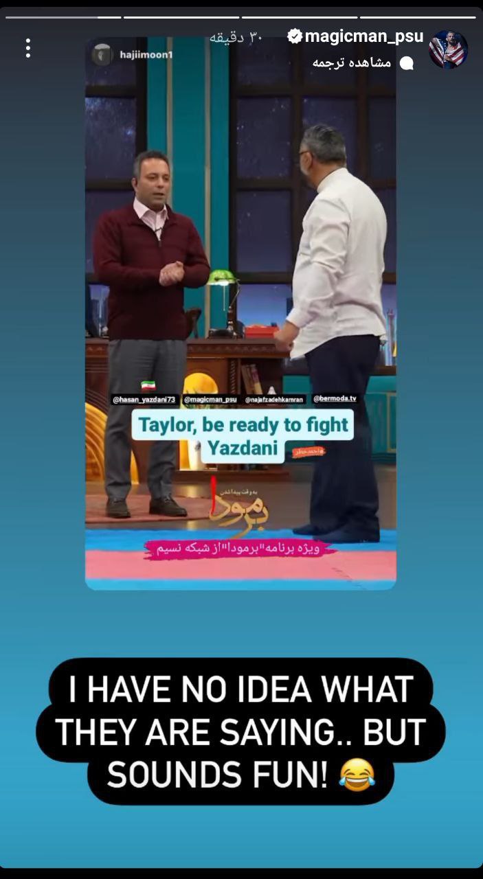 🔹حالا تیلور در صفحه رسمی خود با انتشار این ویدیو با اشاره به مجدزاده نوشته :«نمی دانم چه میگوید اما بامزه به نظر میاد».
