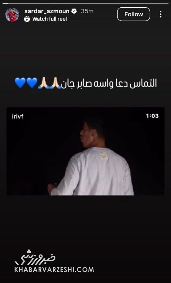 اکنون سردار آزمون، مهاجم تیم ملی فوتبال ایران با انتشار ویدیو و پیامی در فضای مجازی برای صابر کاظمی آرزوی سلامتی کرده است